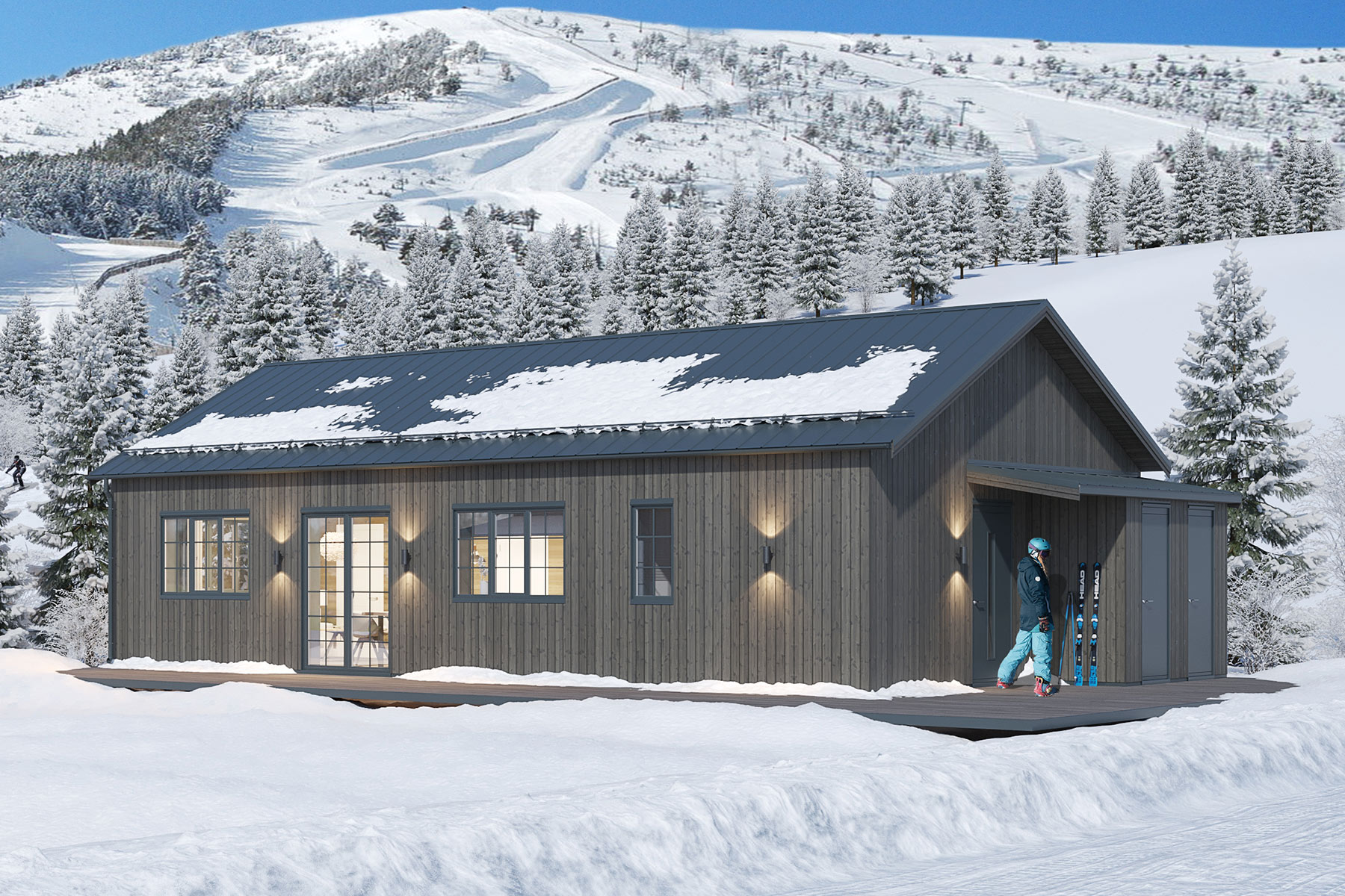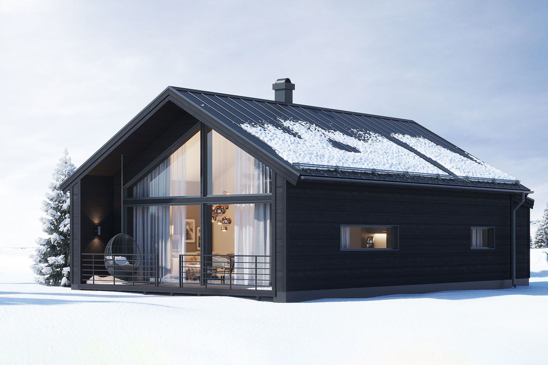 Detta hus har vi tagit fram till ett nytt husområde i Kungsberget. Uppdraget var att var att få plats för en stor skidfamilj på 76 kvm, samt att hålla ett lågt pris på huset. Vi har designat med en modern form, falsat tak och rena linjer utan takfot. Huset rymmer två wc, bastu, stort kök/allrum samt 8 bäddar. Ett funktionellt hus för aktiva familjer till ett lågt pris.